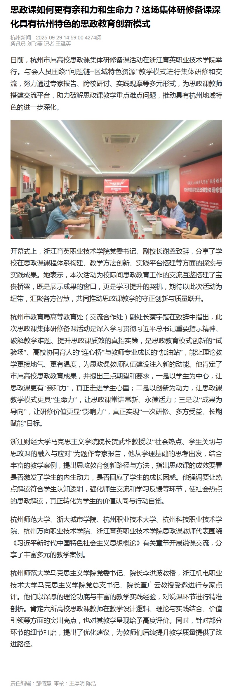 日前,杭州市屬高校思政課集體研修備課活動在浙江育英職業(yè)技術學院舉行。與會人員圍繞“問題鏈+區(qū)域特色資源”教學模式進行集體研修和交流,努力通過專家報告、跨校研討、實踐觀摩等多元形式,為思政課教師搭建交流平臺,助力破解思政課教學重點難點問題,推動具有杭州地域特色的進一步深化。