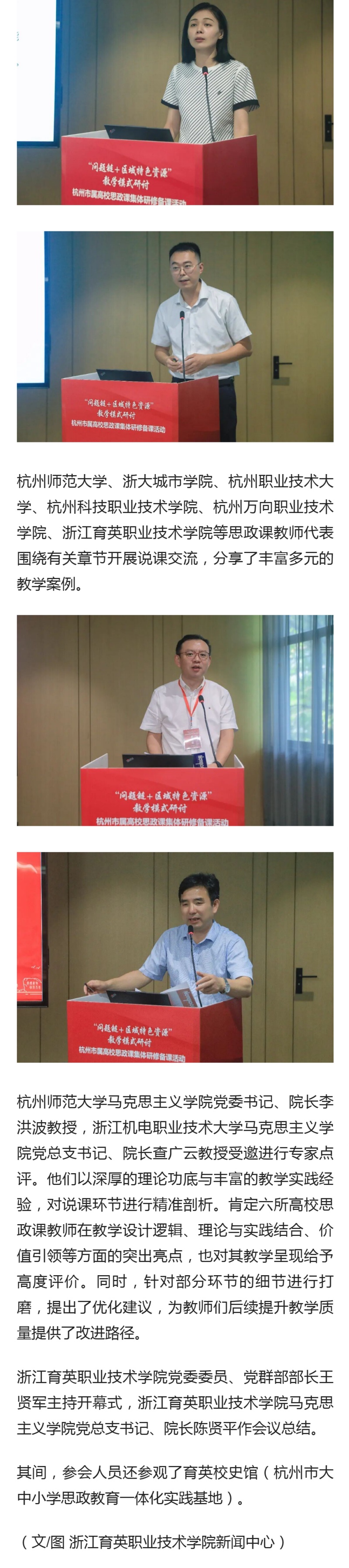 本次活動(dòng)由中共杭州市委宣傳部、杭州市教育局指導(dǎo),浙江育英職業(yè)技術(shù)學(xué)院、杭州師范大學(xué)主辦,杭州市屬高校思政教育聯(lián)合體成員單位協(xié)辦,市屬高校教研部(室)主任、思政課教師代表參會(huì)。