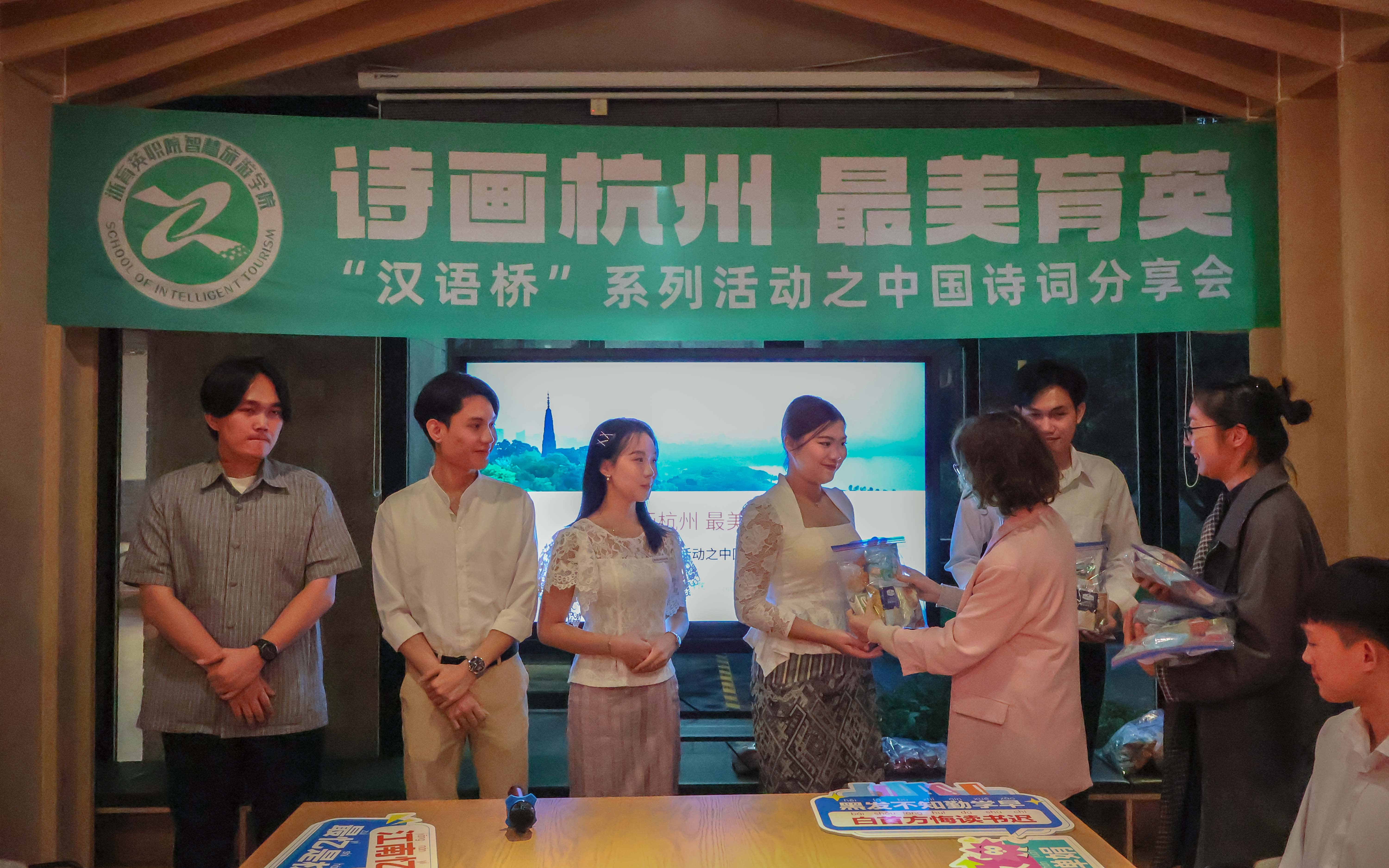 11月7日下午,智慧旅游學(xué)院"漢語橋"系列活動之"詩畫杭州,最美育英"中國詩詞分享會在書吧舉辦。來自老撾的留學(xué)生與6名中國學(xué)子共聚一堂,在葛秀華老師、輔導(dǎo)員董文老師的指導(dǎo)下,開啟了一場跨越國界的文化對話。