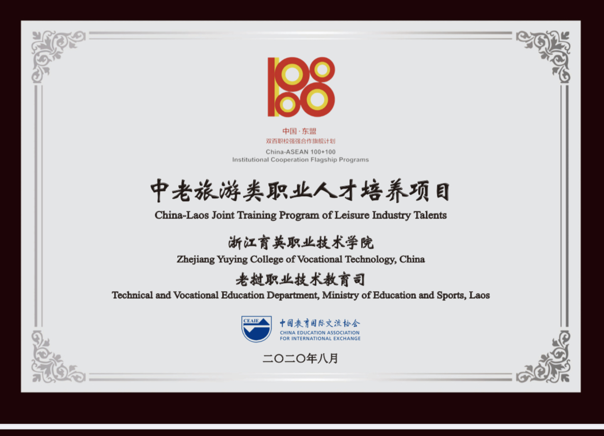 2020年中國-東盟職業(yè)教育國際論壇暨各色合作項目成果展”于8月26日在線上舉辦。期間,由浙江育英職業(yè)技術(shù)學(xué)院與老撾教育部職業(yè)技術(shù)教育司共同組織的“中老旅游類職業(yè)人才培養(yǎng)項目”,成功入選“中國-東盟雙百職校強強合作旗艦計劃”第三批特色合作項目。