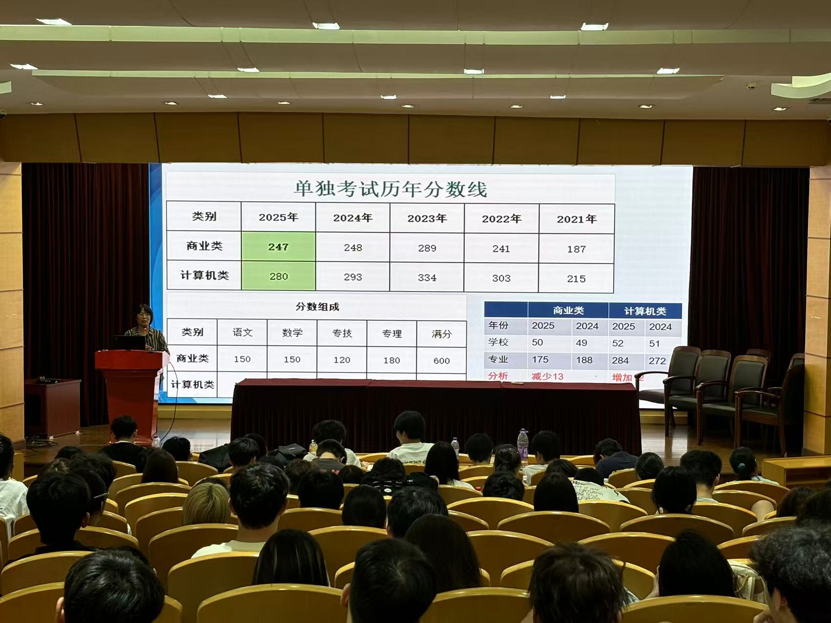 新生培訓(xùn)會上,王衛(wèi)平老師首先向?qū)W生分析了單獨考試近兩年的情況,幫助學(xué)生了解目前的考試形勢,提高他們對考試的認(rèn)識。其次,王衛(wèi)平老師介紹了目標(biāo)學(xué)校和目標(biāo)專業(yè)設(shè)定,其中詳細(xì)展示了商業(yè)類和計算機類的各院校往屆分?jǐn)?shù)線和目標(biāo)考分的設(shè)定,并以浙江育英職業(yè)技術(shù)學(xué)院為例,介紹了目標(biāo)專業(yè)電子商務(wù)和計算機應(yīng)用技術(shù)的目標(biāo)考分,讓學(xué)生更清楚地了解自己目前的差距,同時向在座的學(xué)生介紹了一年期單獨考試培訓(xùn)教學(xué)安排,最后分三個學(xué)習(xí)階段分別給出了相應(yīng)的語文和數(shù)學(xué)學(xué)習(xí)建議。