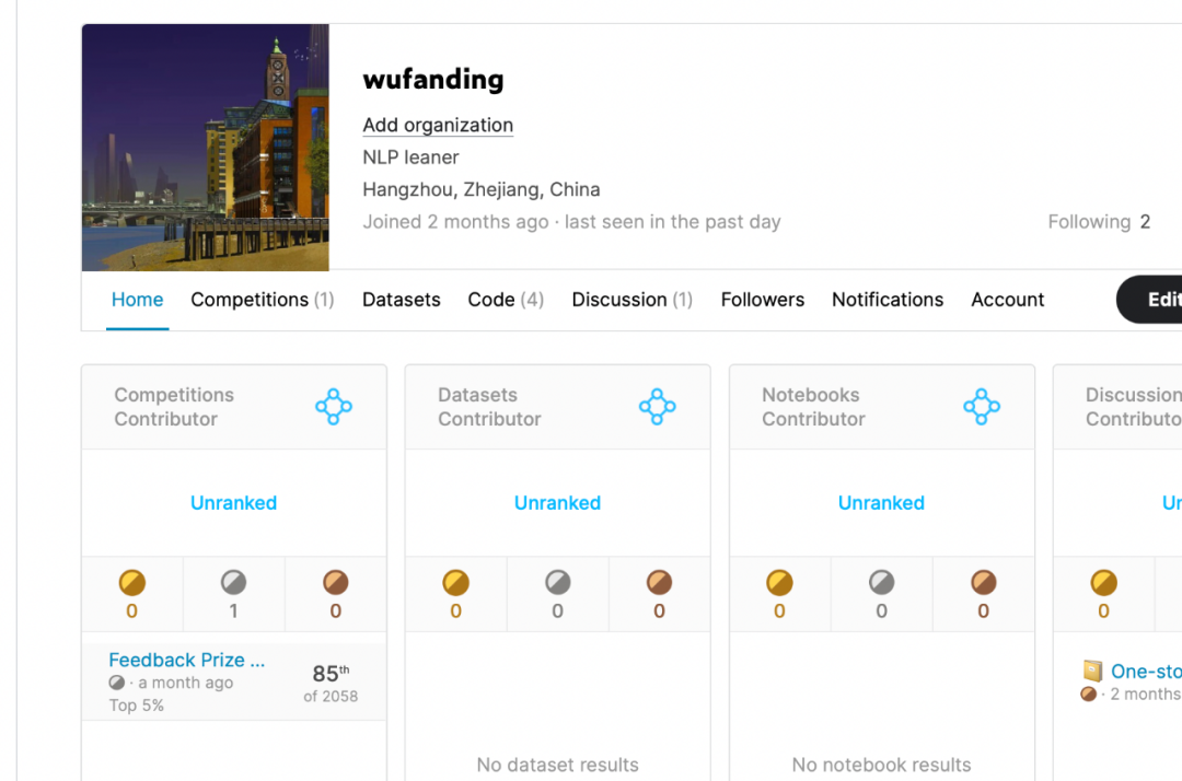 在Kaggle平臺上,每位選手參加過的競賽、排名和分享的資料,都會記錄并顯示在個人主頁。參加Kaggle平臺的高質(zhì)量競賽,獲得好名次,是實力的極好證明,也給丁吳凡的履歷增添了耀眼的一筆。