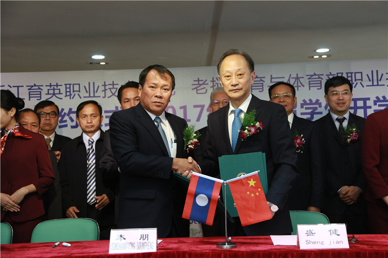 本朋和盛健分別代表老撾教育與體育部職業(yè)技術(shù)教育司和浙江育英職業(yè)技術(shù)學(xué)院簽訂合作備忘錄。