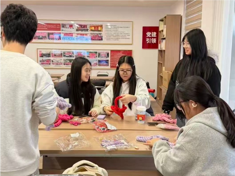隨后進入熱鬧的手工編織環(huán)節(jié)。提前已備齊紅繩、剪刀、吉祥掛飾等材料,大家一起摸索萬字結(jié)的編織步驟——繞繩、打結(jié)、拉緊、塑型。同學(xué)們手持紅繩,反復(fù)嘗試,遇到編錯或不熟練的地方,便主動向身邊的老師和同學(xué)請教。“這個繩結(jié)的松緊度怎么把握呀?”“配飾總?cè)菀谆湓趺崔k?”師生圍坐一起,邊編織邊交流,原本生疏的手法漸漸熟練,一個個立體飽滿、寓意吉祥的萬字結(jié)陸續(xù)成型,每一件作品都承載著大家的專注與期許。