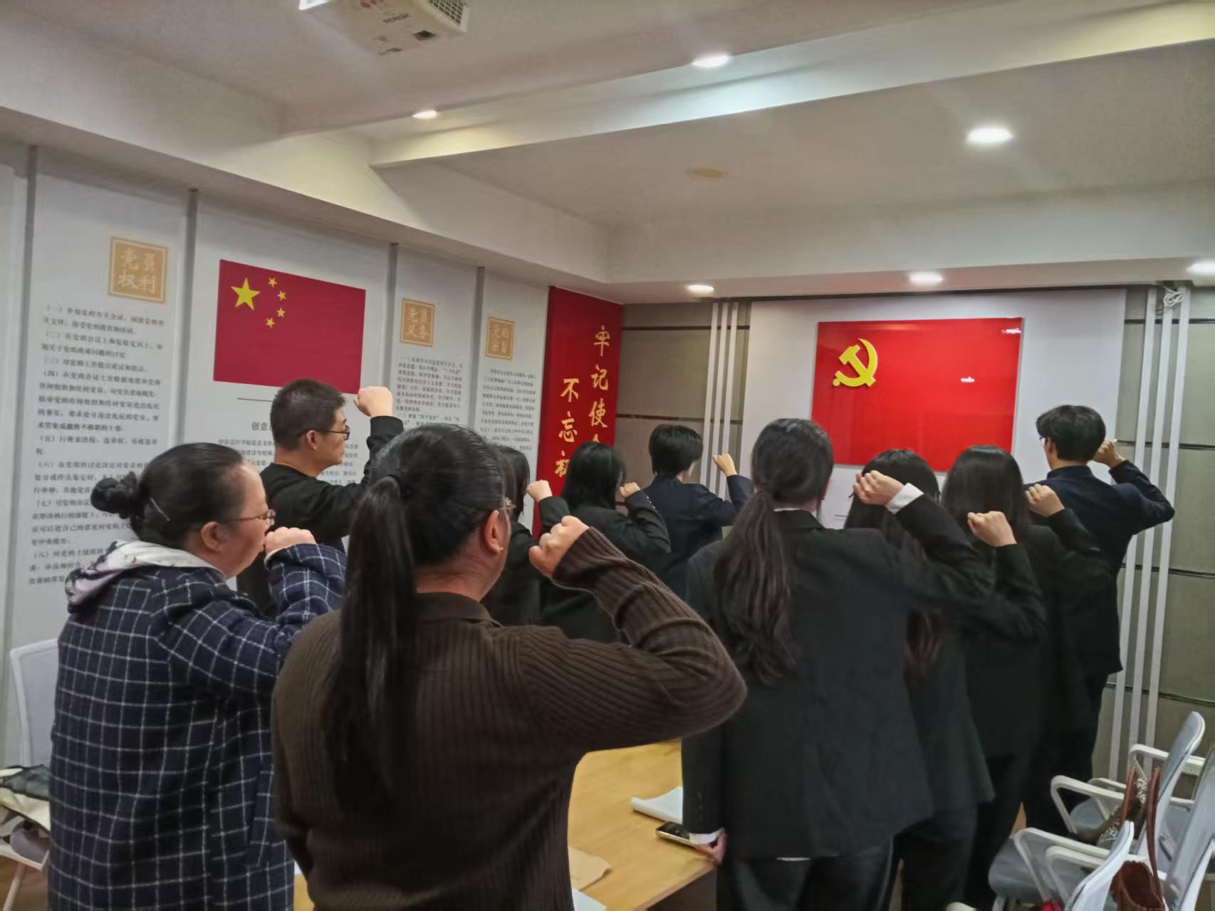 會議第三項(xiàng),重溫入黨誓詞,全體成員對著黨旗宣誓,承諾將以黨員標(biāo)準(zhǔn)嚴(yán)格要求自己,堅(jiān)定理想信念,勤學(xué)善思篤行,積極發(fā)揮先鋒模范作用。