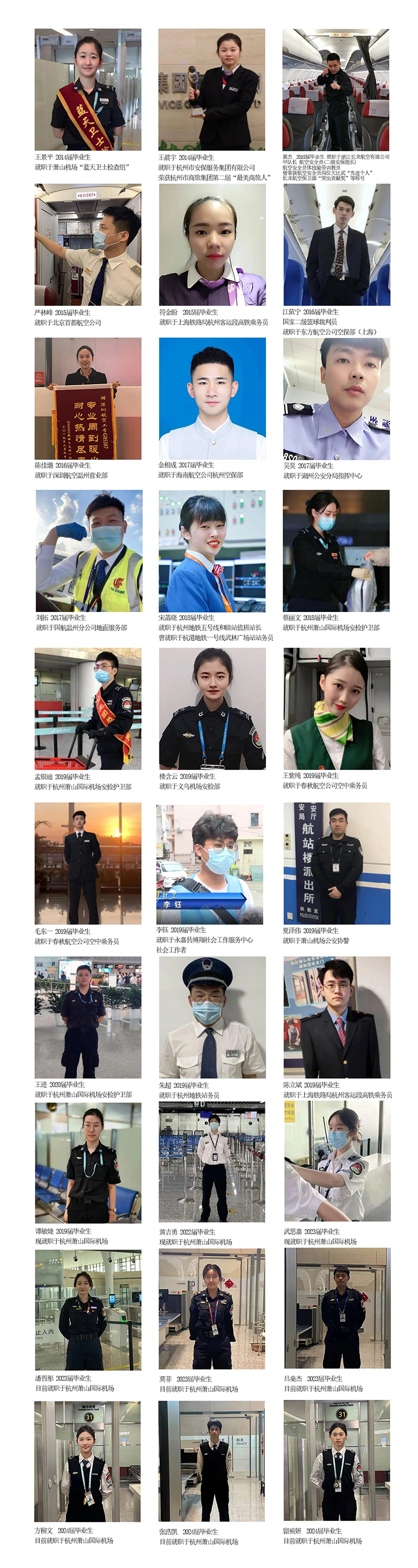 ??本專業(yè)畢業(yè)生可從事機(jī)場、航空公司、航空貨運(yùn)站等單位的安檢及地勤、空中乘務(wù)(安全員方向)、航空運(yùn)輸安全管理,巡特輔警,高鐵、地鐵、港口、長途客運(yùn)、物流、郵局、海關(guān)及重要場館的安全檢查及相關(guān)管理崗位。浙江省機(jī)場集團(tuán)在十四五期間重點(diǎn)打造世界一流的“多式聯(lián)運(yùn)”空港綜合交通樞紐、服務(wù)“一帶一路”的國際航空樞紐,目前我校與省內(nèi)各機(jī)場建立了全面的校企合作關(guān)系,共推進(jìn)人才培養(yǎng)項(xiàng)目的實(shí)施與開展。同時(shí)浙江省已成為我國少數(shù)已建成高鐵里程超過普速鐵路的省份之一,特別是杭州、寧波、溫州、紹興等地的城市軌道交通相繼開通,高鐵安檢、地鐵安檢巨大的人力資源缺口為安檢專業(yè)學(xué)生提供了廣闊的就業(yè)空間。